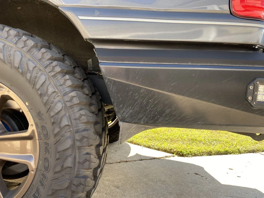 The rear bumper still sits high off the ground, keeping the dual exhaust tips close to the truck.